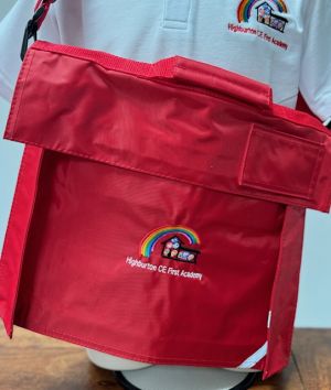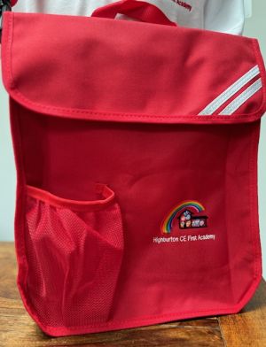 - Highburton CE First Academy Embroidered Book Bag with Strap (Including School logo)Material: 420D polyester. •Detachable adjustable webbing shoulder strap. •Padded handle. •Covered name card holder. •Rip-Strip™ closure. •Internal zipped pockets. •Reflective safety stripe on front. •Capacity 5 litres. Free delivery to your School with this item. Learn More£7.96