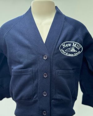 - New Mill Junior School cardigan with school logo navyTwo Front pockets Raglan Sleeves Ribbed Cuffs and Welt 45% ACRYLIC 30% COTTON 15% POLYESTER 10% MIXED FIBRES Learn More£12.95